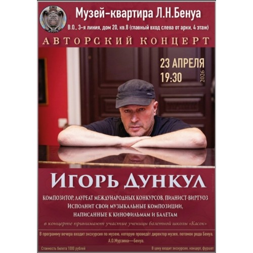 Приглашаем вас на незабываемый и уникальный концерт талантливого композитора и виртуозного пианиста Игоря Дункула, который состоится скоро в концертном зале музея Л. Н. Бенуа. Это событие не стоит пропускать – оно станет настоящим праздником для всех любителей классической музыки.
