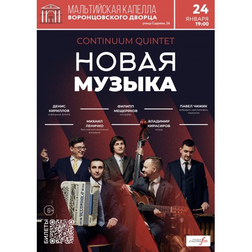 Приглашаем вас провести вечер 24 января в компании хорошей музыки! На сцене Мальтийской капеллы замечательный коллектив музыкантов «Continuum Quintet» — пятеро композиторов-единомышленников, играющих современный авторский джаз. В программе концерта — лучшие композиции, уже полюбившиеся публике. Также вас ждёт редкая возможность первыми услышать сочинения из нового альбома в живом исполнении.
