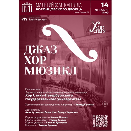 В программе концерта сочинения выдающегося американского композитора и дирижера Леонарда Бернстайна, автора знаменитой Вестсайдской истории, а также музыка английского композитора, умело сочетающего классические жанры с джазовыми элементами. Мелодичность, необычные гармонии, блюз и джазовое настроение в исполнении хора СПБГУ, лауреата всероссийских и международных конкурсов, ждут вас на концерте.