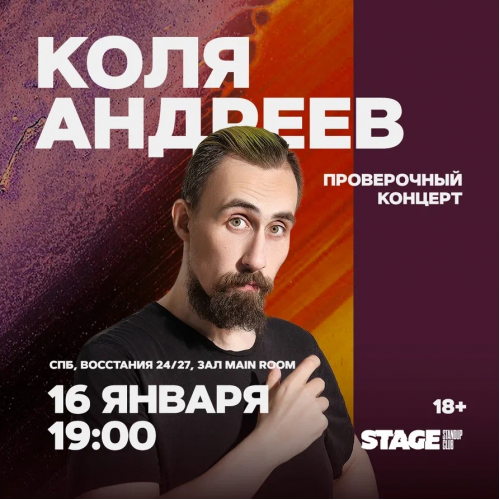 Николай Андреев — интеллигент, утонченный романтик, философ с растянутыми моральными рамками. Ласкает уши тонким умным юмором: смешно не только от самой шутки, но и от изящности и оригинальности мышления. При этом Коля — комик не только для элиты. Даже с тем, кто не понимает его шуток, он хотел бы просто бухнуть и поговорить, выслушать историю о том, как девушка изменила ему на матрасе с эффектом памяти.
