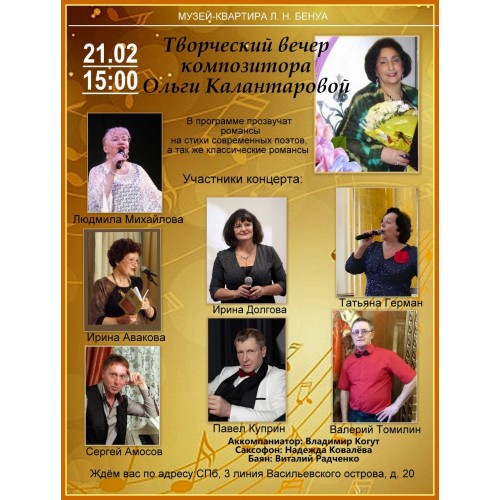 Приглашаем всех желающих на творческий вечер исполнительницы романсов и Санкт-Петербургского композитора Ольги Николаевны Калантаровой в мемориальной квартире семьи Бенуа.