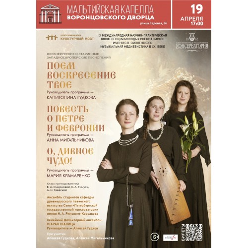 19 апреля в 17.00 в Мальтийской капелле Воронцовского дворца прозвучат старинные русские и западноевропейские песнопения, хоралы, произведения раннего русского многоголосия, духовные стихи и канты, барочные композиции, народные песни. В концерте прозвучат три программы, в которых исполнители вместе со слушателями смогут взглянуть на мир глазами старинного сказителя и музыканта.