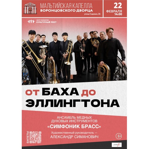 Ансамбль медных духовых инструментов «Симфоник Брасс» под управлением Александра Симановича представляет зажигательную программу «От Баха до Эллингтона». Вы услышите всю мощь и многогранность медной духовой палитры. Брасс-ансамбли, обладая особым, торжественным и в то же время камерным звучанием, сочетают в себе акустическую мощь оркестра и виртуозность сольного исполнения. Их особая тембровая теплота, блеск и динамичность позволяют интерпретировать музыку самых разных эпох.