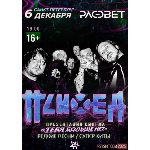 После первой части успешного тура по России группа решила сделать вторую часть весной!! А пока разбирает архивы и презентует сингл «Тебя больше нет», из планирующегося к выходу весной ЕР неизданых и редких песен Психеи записанных в современном звуке!Композиция из 99-2000 года, которая только исполнялась на концертах увидит свет в студийной версии! На релизе планируется еще 4 или 5 песен! Так же на концерте будут исполнены композиции не часто играемые на концертах и конечно все суперхиты с самых разных альбомов! Авторское видеошоу, свет, звук, горы нового мерча также будут присутствовать на концерте! Ну и конечно атмосфера праздника Психеи, которую создаете все вы — поклонники творчества самых разных возрастов и поколений! Ждем Всех!