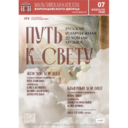Мальтийская капелла Воронцовского дворца приглашает слушателей на вдохновляющий концерт «Путь к свету» — музыкальное путешествие, которое откроет вам мир гармонии, глубины и красоты хорового и органного искусства. В программе прозвучат произведения русских и европейских композиторов, которые тронут сердце и напомнят о силе музыки как универсального языка души.