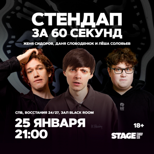 Интерактивное стендап-шоу, в котором у каждого участника есть только 1 минута на выступление, после чего он остается на сцене и общается с ведущими. Непредсказуемые интервью, никакой редактуры и много комиков за раз.