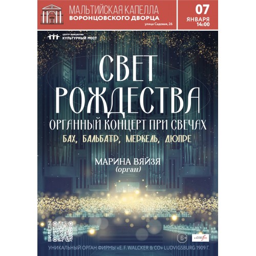 Величественный король инструментов зазвучит под сводами Мальтийской капеллы, чтобы поведать вам многовековую музыкальную историю светлого праздника Рождества и рассказать об органных традициях. В программе — шедевры композиторов разных эпох: от произведений великого гения И.С.Баха и изящных сочинений французских композиторов Ж.-К.Бальбатра и М.Дюпре до проникновенных композиций Г.-А.Меркеля. Эта музыка, дополненная известными произведениями Чайковского и Вивальди, создаст неповторимую атмосферу праздника, где торжественное величие барокко встречается с трогательной нежностью романтизма.