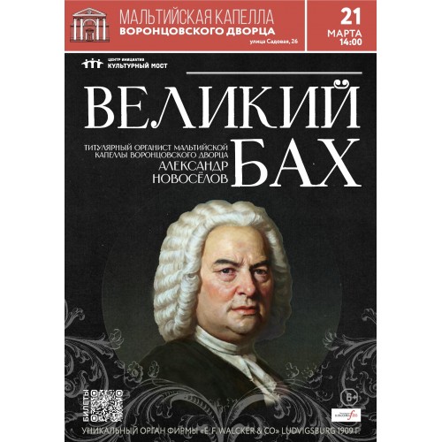 21 марта мы приглашаем вас насладиться авторской программой, состоящей из избранных произведений И. С. Баха, в исполнении титулярного органиста Мальтийской капеллы Воронцовского дворца Александра Новосёлова! Прозвучат знаменитая "Чакона" из Партиты для скрипки ре-минор, "Ария" из Оркестровой сюиты ре-мажор, Токката и фуга ре-минор и другие шедевры великого немецкого композитора.