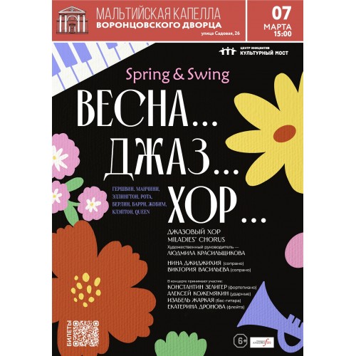 Концерт «Весна, джаз, хор» — это особое событие, где великий американский джаз и золотая классика мирового кинематографа обретают новое, свежее звучание. Это не просто джазовый вечер; это симфония множества голосов, сплетающихся в легкие, воздушные и в то же время полные внутренней силы импровизации. Вы услышите, как виртуозный свинг Дюка Эллингтона и искрящиеся ритмы Ирвинга Берлина наполняются дыханием целого хора. Шедевры Гершвина и Манчини, пронизанные лиризмом темы Нино Роты зазвучат с новой эмоциональной глубиной, открывая слушателю знакомые гармонии с неожиданной стороны. Яркими красками прозвучат темы из фильмов Джона Барри, босса-нова Антониу Карлоса Жобима, а также знаменитые композиции Эрика Клэптона и группы Queen в хоровом исполнении.