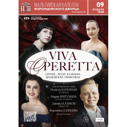 Погрузитесь в чарующий мир музыки, искрящейся, как брызги шампанского! В дни новогодних праздников приглашаем вас на концерт, посвященный королеве жанров – оперетте. Наш концерт – это калейдоскоп самых ярких мелодий великих мастеров жанра: Штрауса, Кальмана, Легара, Дунаевского, Оффенбаха. Знакомые с детства вальсы и польки, зажигательные куплеты и трогательные арии, полные страсти дуэты прозвучат со сцены Мальтийской капеллы в этот вечер. Ощущение праздника создадут замечательные молодые вокалисты Пелагея Куренная, Мария Братухина, Даниил Казаков. Роль оркестра за роялем исполнит Вероника Солнцева.