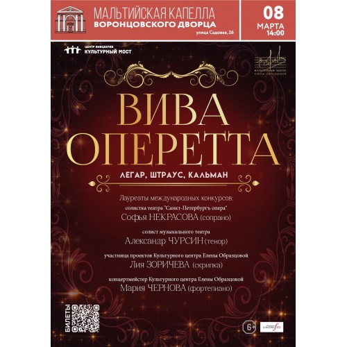 Почувствуйте дыхание наступающей весны под чарующие мелодии Имре Кальмана, Франца Легара и Иоганна Штрауса! 8 марта, в самый женственный и яркий праздник, в стенах величественной Мальтийской капеллы прозвучит гимн красоте, любви и радости жизни — концерт «ВИВА, Оперетта!».