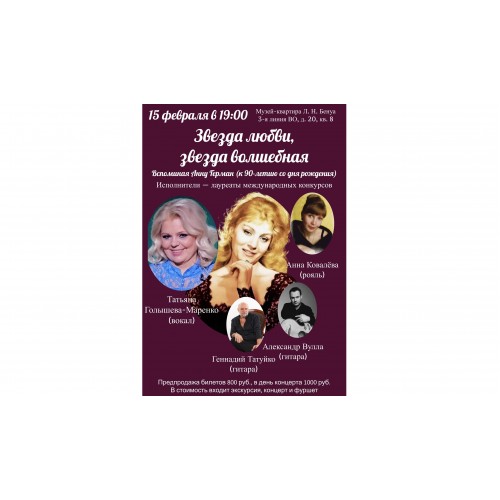 Прозвучат песни из репертуара Анны Герман: «Письмо Шопену», «Танцующие Эвридики», «Снова мамин голос слышу», «Осенняя песня» и другие, а также старинные и современные романсы и песни.