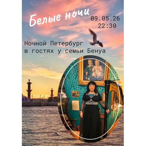 Светский вечер проводит Анастасия Олеговна Мурзина-Бенуа. Вас принимает в гостях хозяйка квартиры: праправнучка выдающегося архитектора, хранительница культурного наследия династии. Авторские программы на темы об истории и искусстве представителей знаменитого рода Бенуа. Живая музыка дарит неповторимые впечатления гостям музыкального салона. Непринужденное и познавательное общение в гостеприимной атмосфере салона.