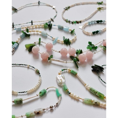 В наличии есть жемчуг и натуральные камни, стеклянные и фигурные бусины и кристаллы разных цветов.