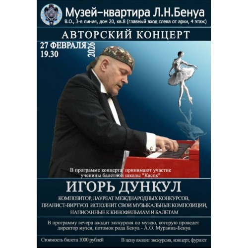 Лауреат международных конкурсов, автор музыки для многих балетов и кино обладатель специального приза за лучшую музыку на международном швейцарском кинофестивале, композитор и виртуозный пианист Игорь Дункул исполнит для вас свои музыкальные произведения, написанные к балетам и кинофильмам.