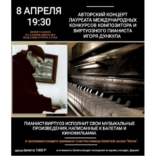 Лауреат международных конкурсов, автор музыки для многих балетов и кино обладатель специального приза за лучшую музыку на международном швейцарском кинофестивале, композитор и виртуозный пианист Игорь Дункул исполнит для вас свои музыкальные произведения, написанные к балетам и кинофильмам.